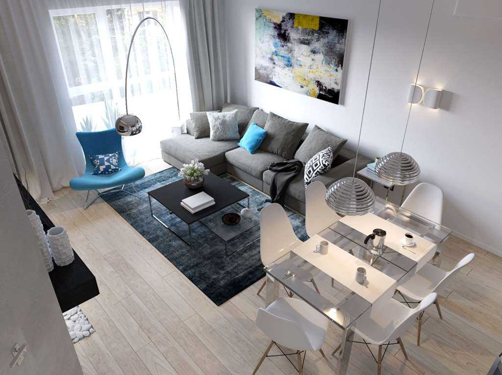 Гостиная в квартире может быть выделена в качестве отдельной комнаты или может быть совмещена с другими помещениями. При этом не стоит забывать про функционал — комната должна быть оборудована системами хранения, которые, однако, не должны занимать все свободное пространство.