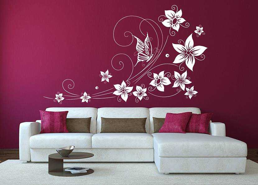 Роспись по трафарету в гостиной комнате на ярком фоне