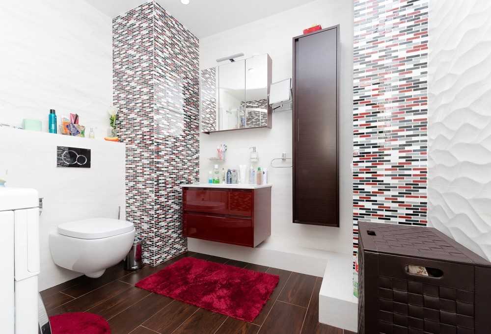 Обратите внимание на эффектный контраст темных и светлых зон в отделке этой ванной комнаты. А в дизайне пола мы нашли керамический паркет под дерево, который гармонично работает в паре с ковриками винного цвета и интересной современной мозаикой, вбирающей все цвета и оттенки этого интерьера