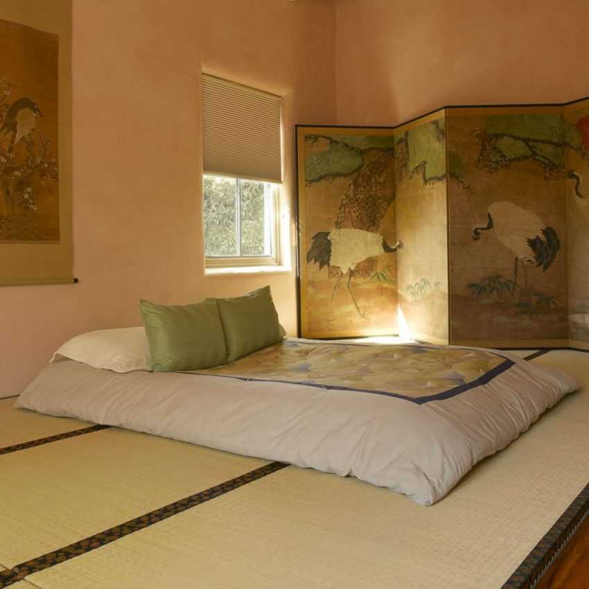 Таким же образом можно украсить двери, перегородки, полки или одну из стен. Для японского стиля характерны низкие кровати из темного дерева с отсутствием изголовья.