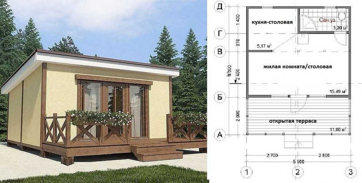 Еще один вариант — одна комната, в которой отведено место под несколько кухонных шкафчиков и плиту, стоит небольшой обеденный стол и есть спальное место. Такая планировка идеальна для проживания одного человека. Неплохо в ней себя будут чувствовать двое. В данном варианте санузла нет, так что придется строить туалет отдельно.