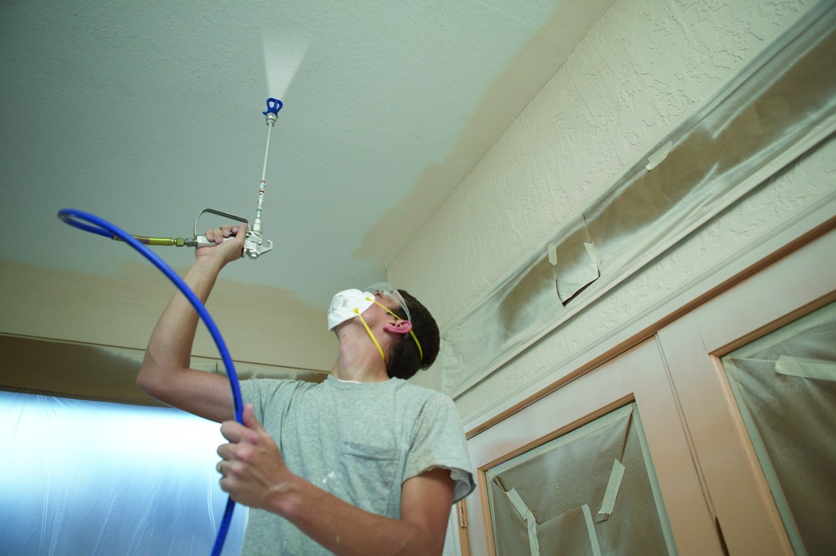 - Даже у простейшего краскопульта для ручной покраски хватает напора, чтобы распылять эмульсионные белила по потолку, находясь в удобном положении (на полу);