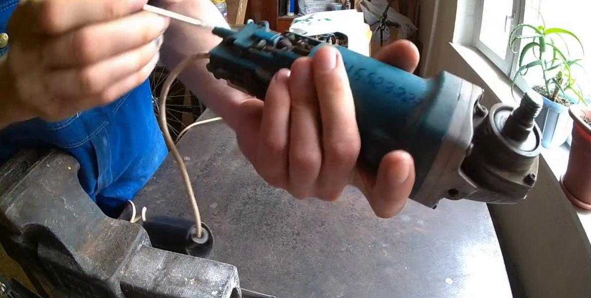 Первым делом потребуется проверка электрического кабеля и вилки на его конце. Если она разборная, то раскрутите ее и проверьте надежность контактов. В противном случае, придется разобрать болгарку (снять кожух аппарата) и “прозвонить” кабель тестером, а также убедиться, что ток подходит к контактам кнопки “Пуск”. Если прибор покажет обрыв, то кабель следует заменить на новый.