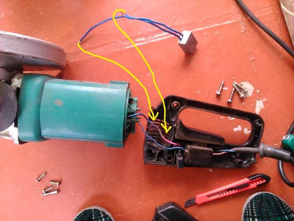 - Ток в прибор поступает, но двигатель не работает — это означает, что с высокой долей вероятности из строя вышла кнопка. На болгарках кнопки неремонтируемые, поэтому после небольшой проверки, ее следует просто заменить