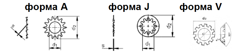 - зубчатые – имеют внутренние, внешние или же оба варианта зубцов, которые могут быть плоской или конической формы, типы таких шайб – A, J, V;