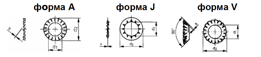 Шайба стопорная круглая с насеченными упругими зубцами DIN 6797. Форма А – внешние зубцы, I – внутренние зубцы, форма V – вогнутая.