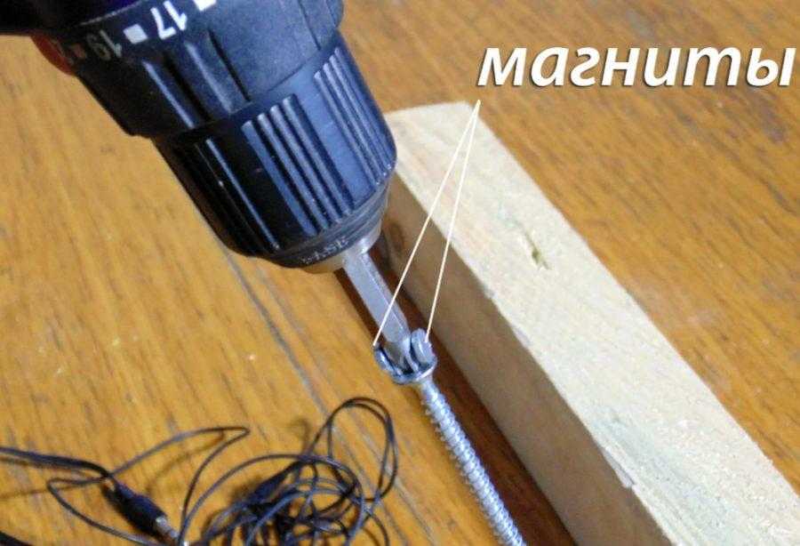Существует несколько разных способов и лайфхаков, которые позволяют вкручивать саморезы в труднодоступные места, удерживая их непосредственно на бите шуруповерта, не позволяя постоянно соскальзывать. Однако если нет под рукой специальных магнитных насадок, постоянно использовать скотч или изоленту неудобно (ведь при проведении сложных работ, когда нужно ввинчивать большое количество шурупов, постоянно обматывать их изолентой весьма проблематично). В этом случае можно взять два небольших магнита, например из самых дешевых китайских наушников, и прикрепить их к поверхности биты. После этого появится магнитное поле, которое не позволит шурупу сорваться.