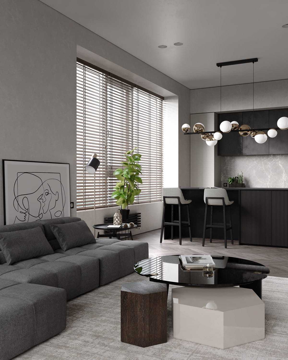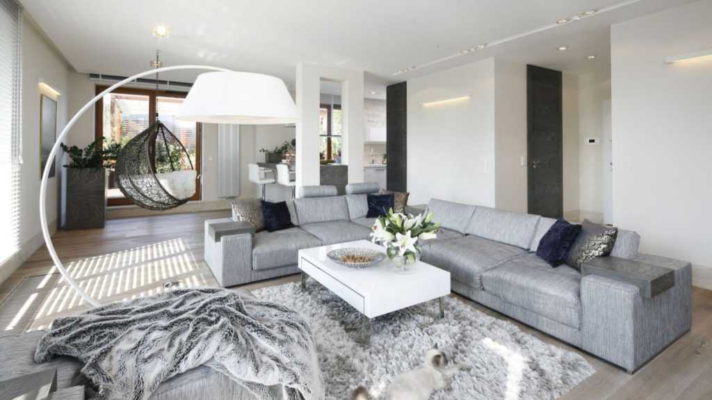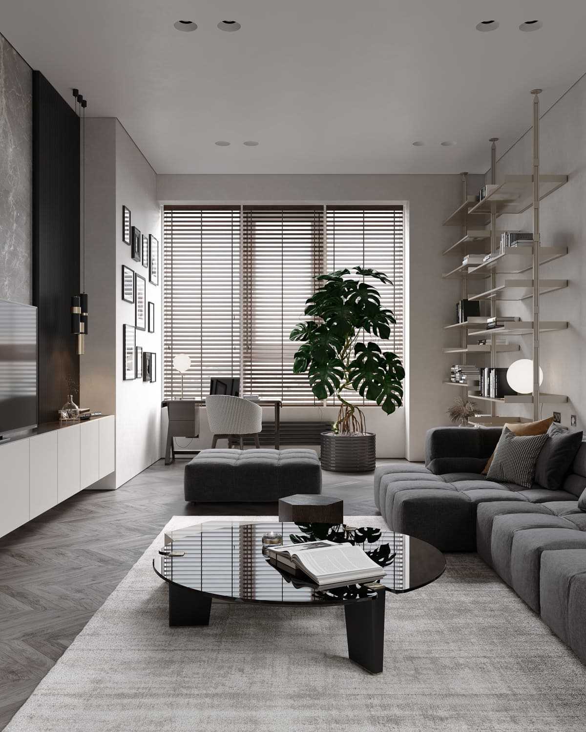 Серая гостиная в стиле минимализма — это прежде всего характерный пол. В этом случае вы можете выбрать плитку или уже упомянутый архитектурный бетон.