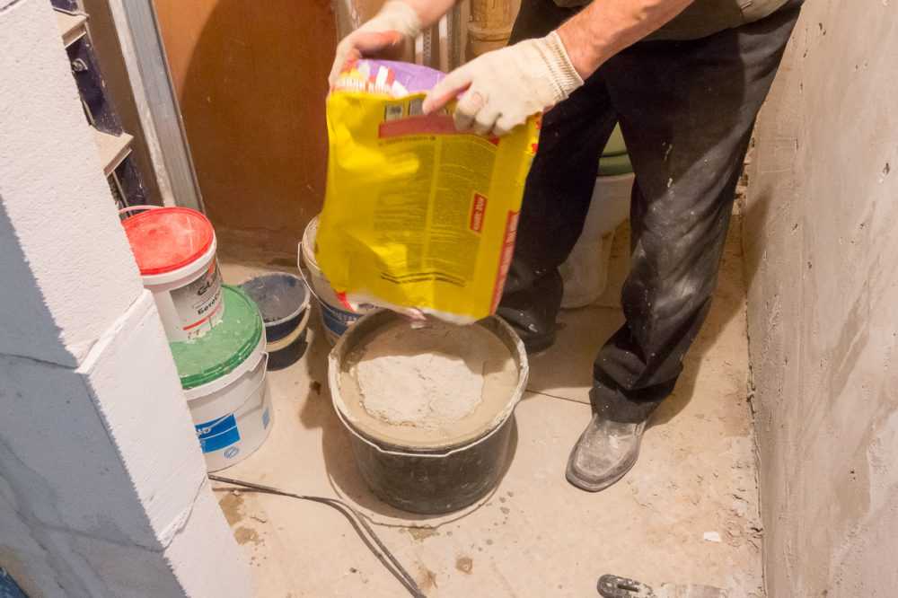 Если единственный источник воды находится в санузле и во время работы доступ к нему окажется невозможен, следует запасти воды. На один мешок 20 кг нужно 4,5 литра воды; для замеса 5 мешков запасаем примерно 25 литров.