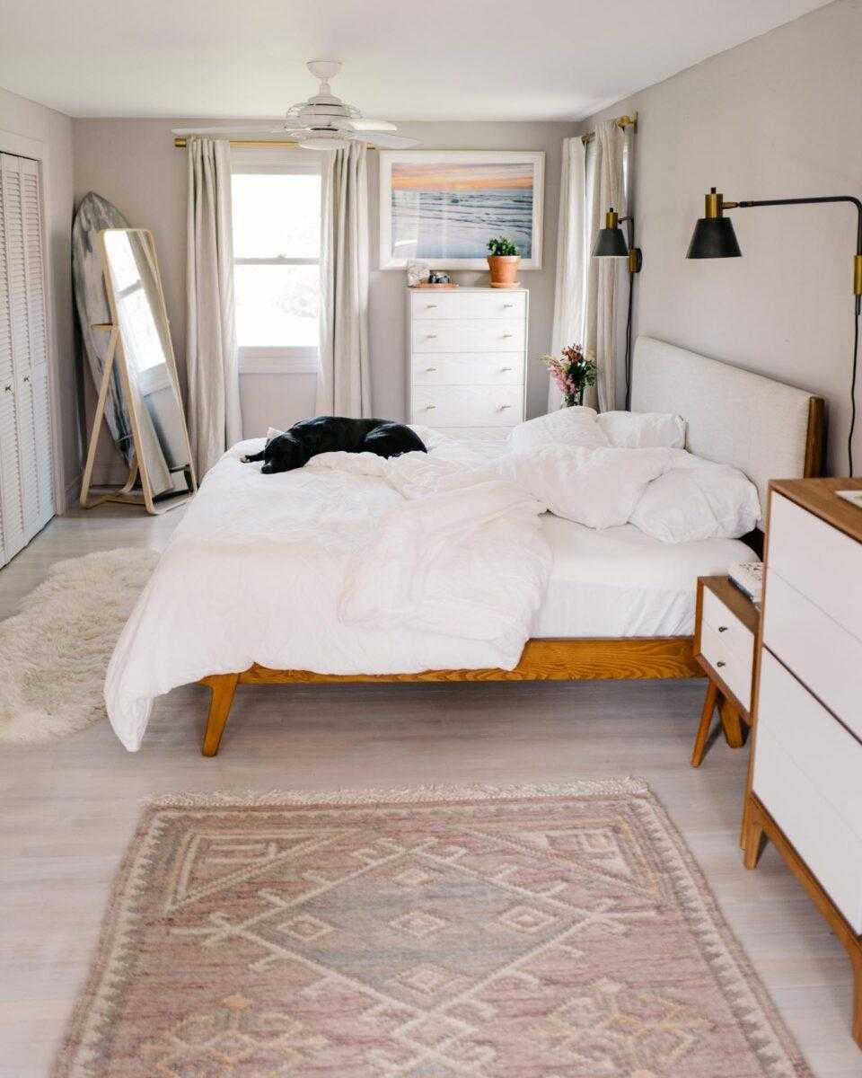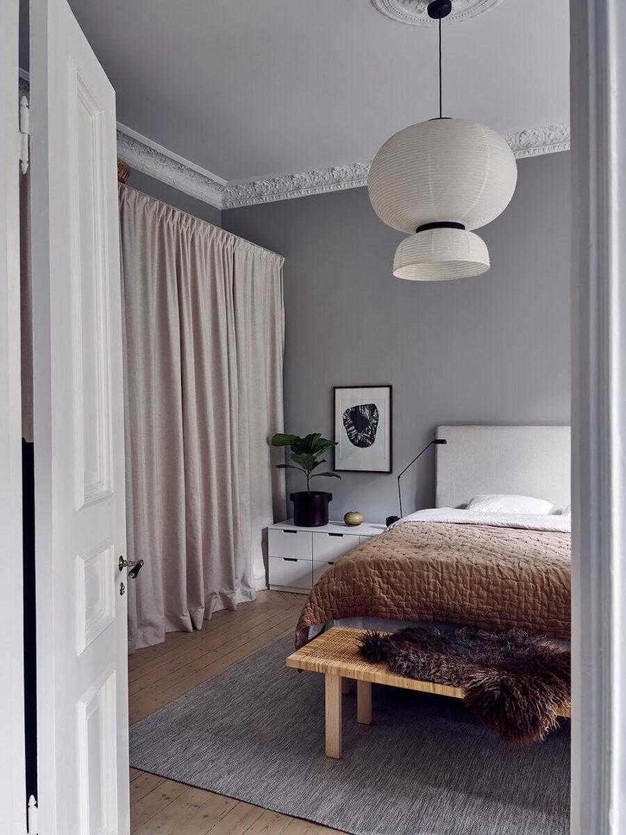 Кроме того, светлые цвета визуально увеличат пространство. Окраска стен и потолка одним оттенком позволит стереть границы между плоскостями и добавить спальне объем.