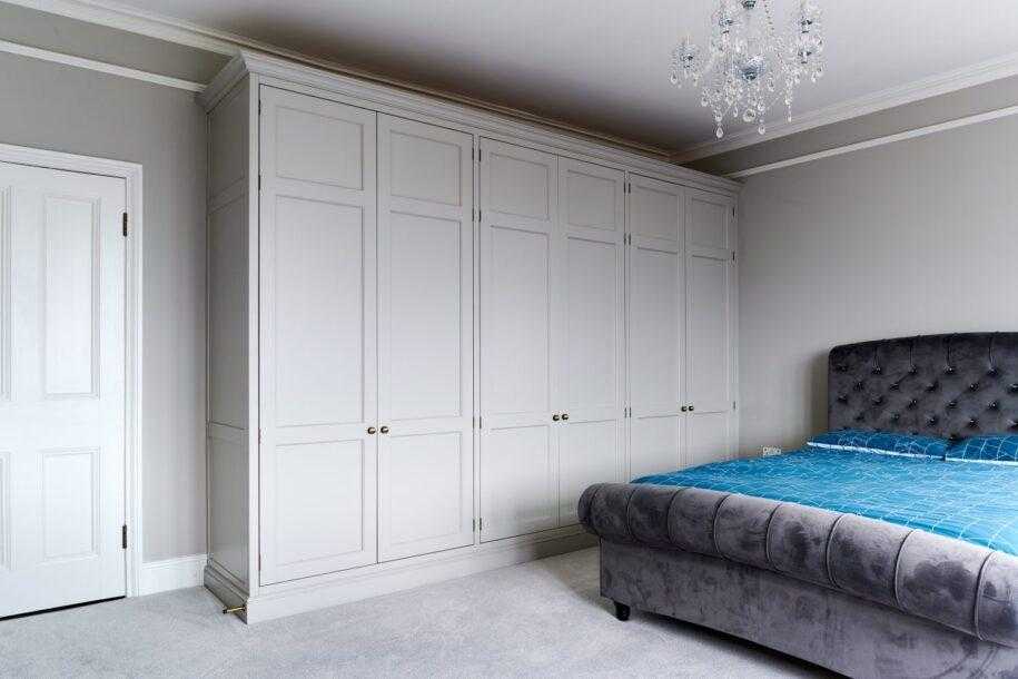 В просторных комнатах позволительно размещать не только кровать, а весь спальный гарнитур. Помимо места для сна в помещении можно оборудовать отсек для гардероба или поставить большой вместительный шкаф.