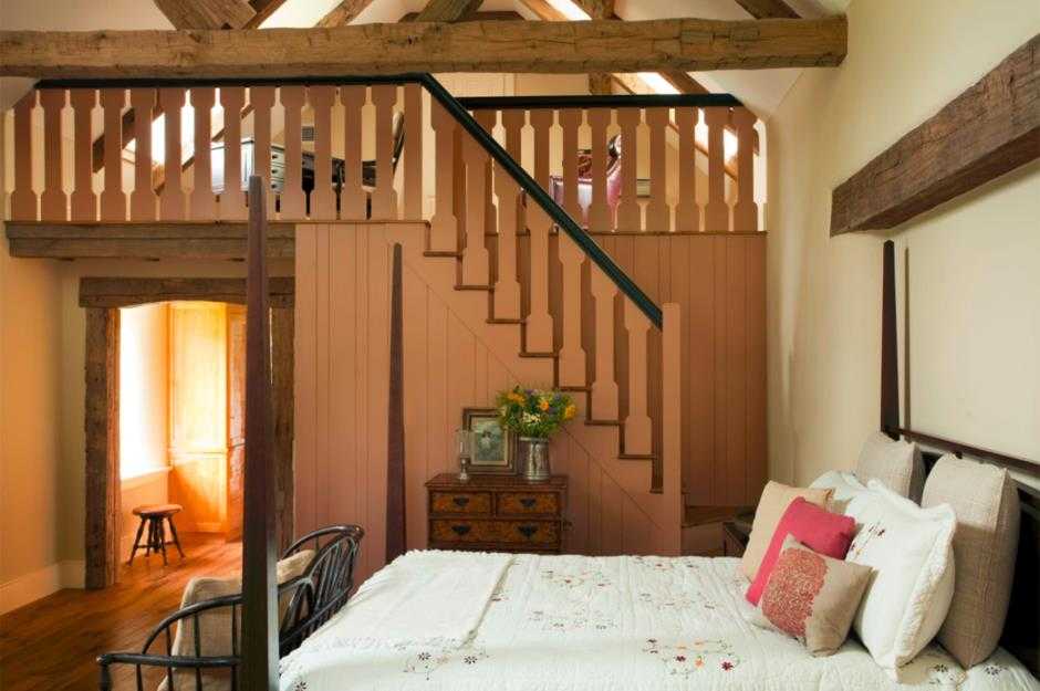 Мансарда в стиле прованс. Фото показывает лаконичную деревенскую мебель для оформления спальни в теплых тонах с присущей потертостью, необработанными элементами старинных деревянных балок