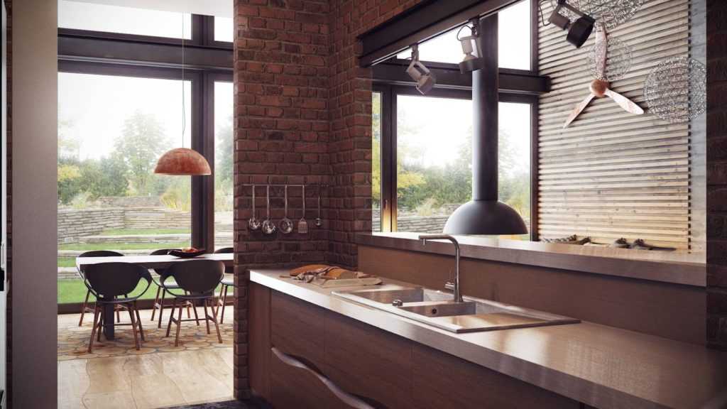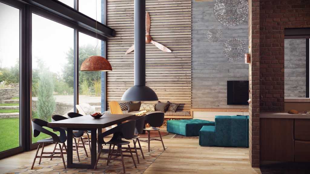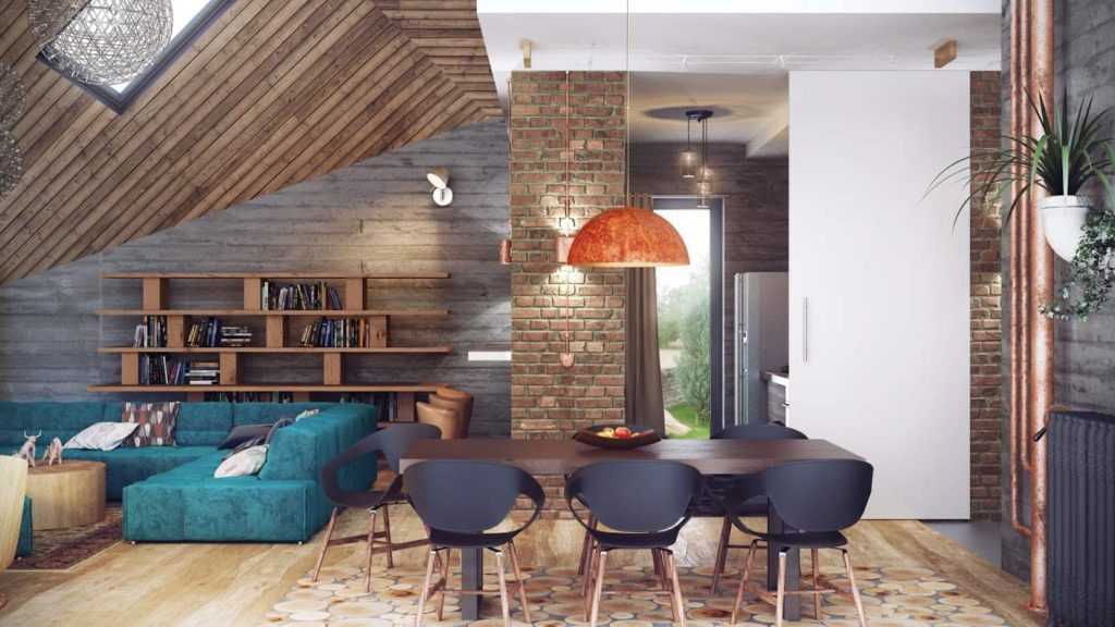 Нестандартная фактурность. Грубая кирпичная кладка и минимальная на вид обработка стен или других поверхностей гармонично сочетается с приятными на ощупь и ласкающими взгляд деревянными вкраплениями, олицетворяющими гармонию природного и техногенного мира.