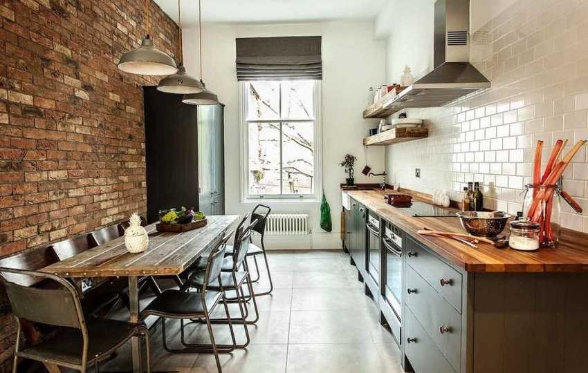 - Помещение, выдержанное в модном индустриальном стиле, многим приходится по вкусу. Подразумевает минимальную отделку стен (часто кирпичная кладка), потолка и пола, или иллюзию отсутствия ремонта.
