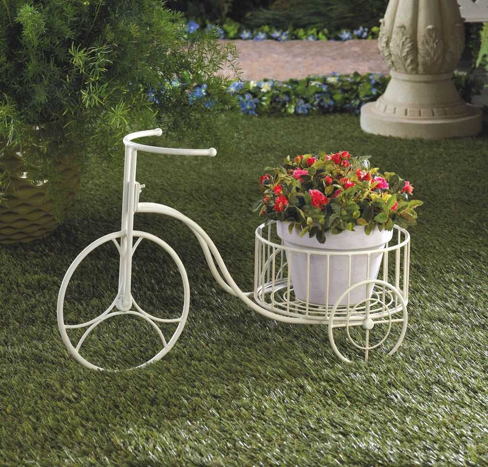 Декоративные. К ним чаще относятся уличные модели, подставки для цветов в саду из металла или дерева, хотя встречаются и, например, настольные модели под один цветок. Внешне такие аксессуары выполняются в виде бытовых предметов: тележки, велосипеда, тачки; иногда бытовые предметы приспосабливаются под вместилище для цветника. Они удобны тем, что позволяют вместить много растений, и одновременно оживляют окружающий пейзаж.