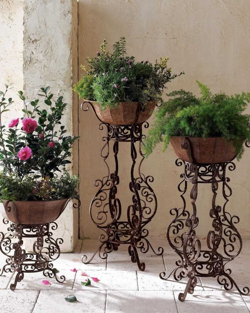 Те, кто хочет добиться оригинальности и изысканности, приобретают кованые изделия. Они могут предназначаться для каждого отдельного цветочка или для нескольких растений.