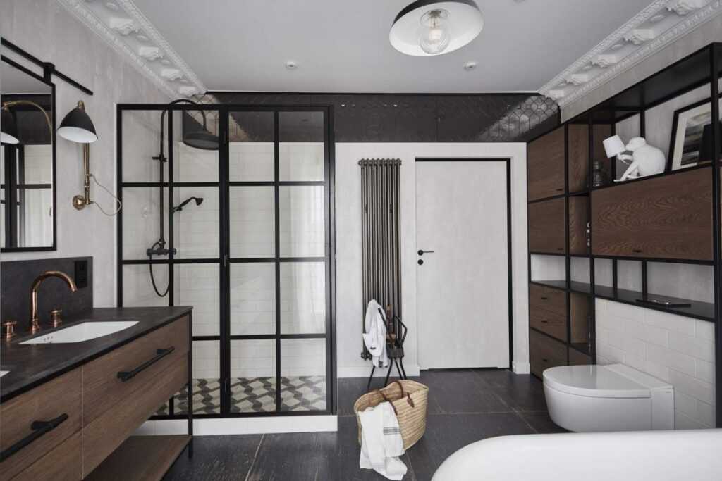 Таким образом, была создана ванная комната, в которой промышленное остекление душа сочетается с элегантной золотой фурнитурой, используемой в умывальнике, так что прочный черный кран снова появляется рядом с элегантной отдельно стоящей ванной, которая является центральным местом проекта.