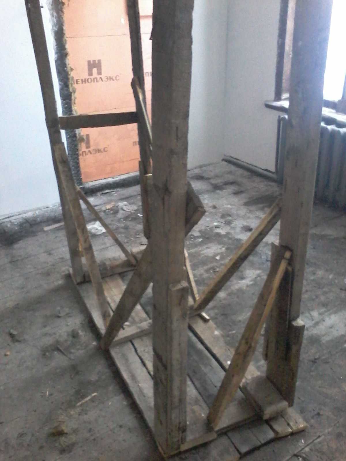 В частности, для создания каркаса выбирают цельный брус шириной не менее 10 см. Торцевые планки конструкции монтируют под острым углом. Две опорные шестиметровые балки укладываются в горизонтальное положение. Расстояние между ними составляет ширину будущих лесов. Рядом на одинаковом расстоянии укладываются еще две шестиметровые балки. Верхние концы балок должны сходиться под небольшим углом в виде трапеции, это придаст устойчивость будущим лесам.