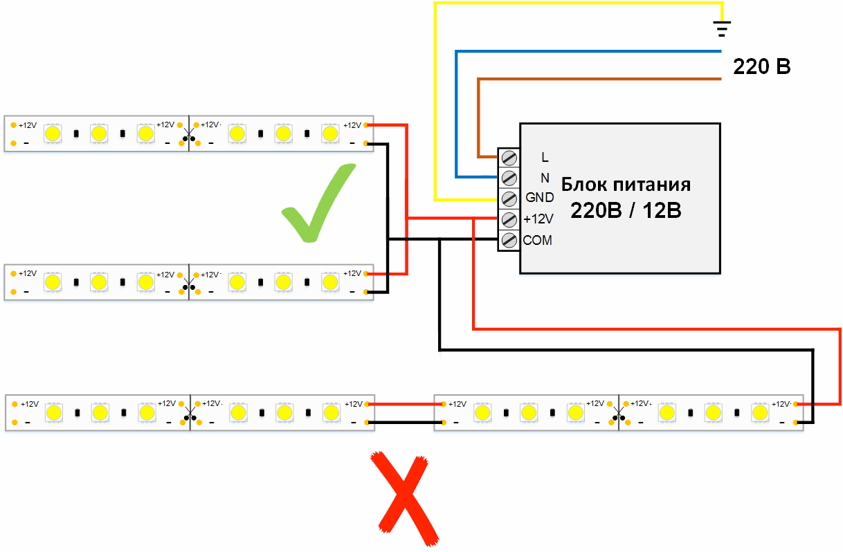 Но общим правилом, которое нужно помнить перед тем, как подключить диодную ленту с любым напряжением к 220 В – никогда не соединять ленты последовательно.