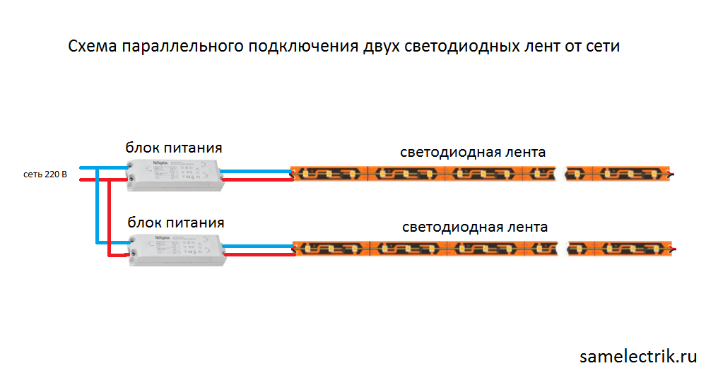 Если перед вами задача – как подключить несколько светодиодных лент к сети 220 В и при этом требуется запитать 2, 3 и более светодиодных лент, то здесь существует 2 варианта: