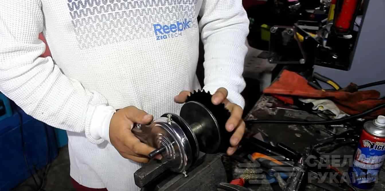 В катушку вставляем подшипники, через которые продеваем резьбовую шпильку. С одной стороны крепится большая шестерня.
