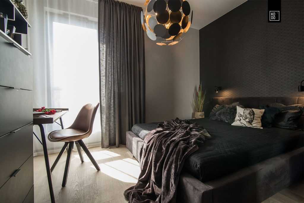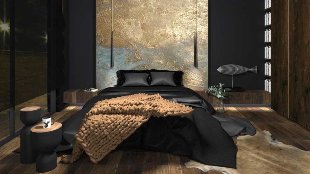 Чем восхищает дизайн спальни с темном отделкой?