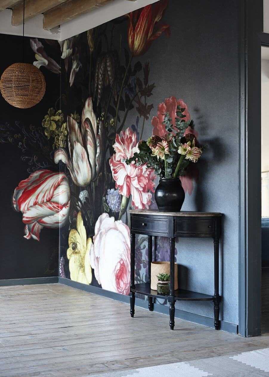цветы на черном фоне смотрятся романтично и нежно, будь то розы, пионы, хризантемы или сирень. Хороший вариант для спальни;