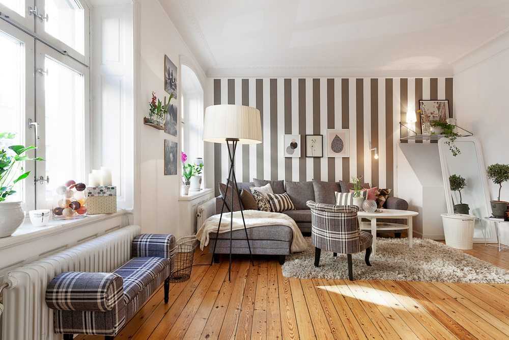 - изменить форму и размеры комнаты. К примеру, гладкие обои в полоску или покрытия с вертикальным рельефом поднимают потолки, текстильные полотна с крупными орнаментами позволяют уменьшить пространство, а светлые глянцевые обои зрительно удлиняют помещение;