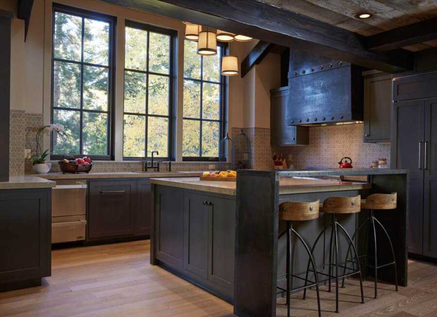 В кухне присутствует несколько функциональных зон. Очень часто темная плитка идет на создание фартука. У этого приема есть и отрицательная сторона — даже брызги чистой воды способны на таком фоне оставлять пятна и разводы.