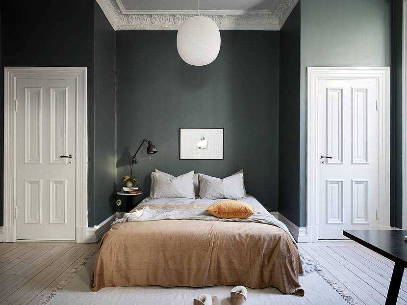 Загадочность и мистическую интимность интерьеру спальни может придать темная стена