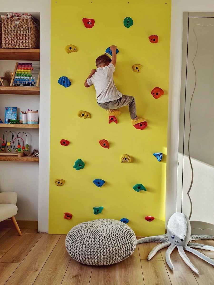 Стильная маленькая детская комната со стенкой для скалолазания, поручнями и умным ящиком для хранения вещей под кроватью Стильная маленькая детская комната в скандинавском стиле в серо-голубых тонахКровать в стиле лофт для маленькой детской комнаты