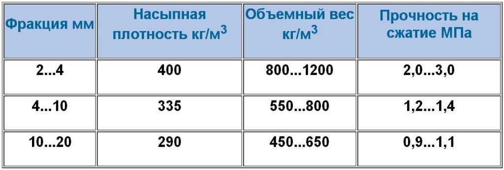 Соотношение между различными марками гравия приведены в таблице. Характеристики других фракций приведены в Государственном стандарте № 32496-2013 от г. «Заполнители пористые для легких бетонов» (приложении «А»).