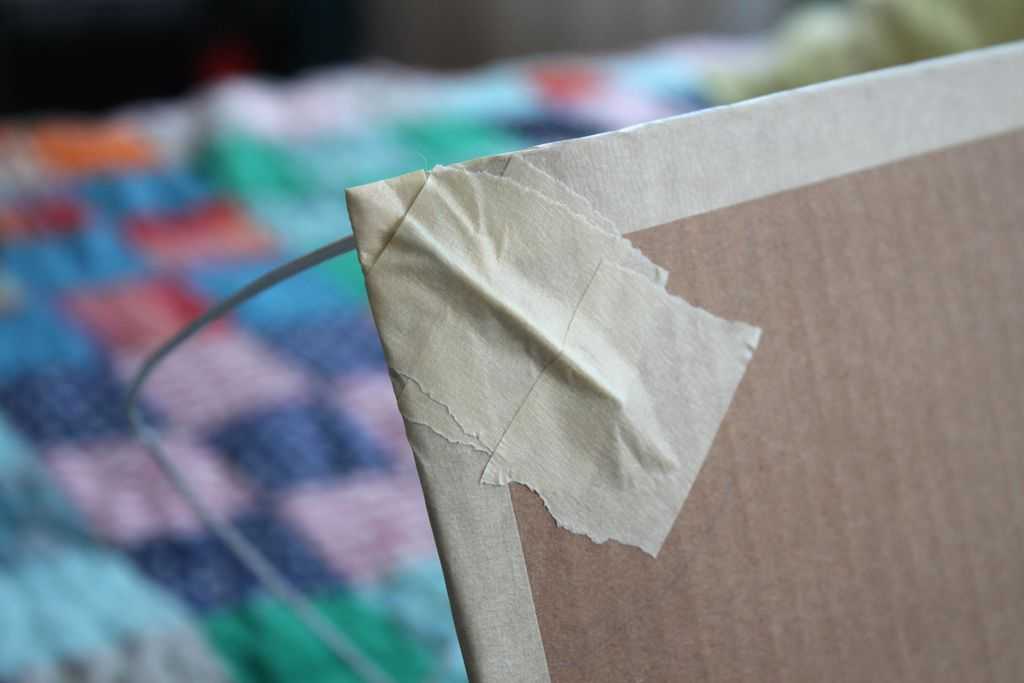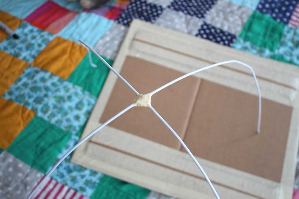 Скрещиваем проволоки и закрепляем верхушку скотчем. Проверьте, чтобы ножки стойки касались углов картона. Вставьте их в отверстия.