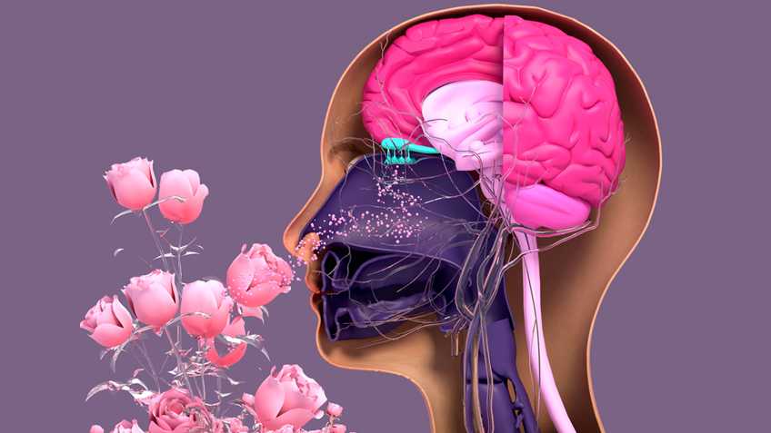 Восприятие запаха начинается с того, что в нос вместе с воздухом залетают душистые молекулы. Воздух проходит через носовые полости, нагреваясь и очищаясь, и попадает на обонятельный эпителий — слой полости носа, покрытый слизью и усеянный обонятельными нейронами. Эти нейроны улавливают запахи, а белки обонятельных рецепторов связывают молекулы душистых веществ. Рецепторы затем посылают электрический сигнал в обонятельные луковицы, расположенные в мозгу на уровне носового моста, то есть примерно там, где сидят ваши очки.