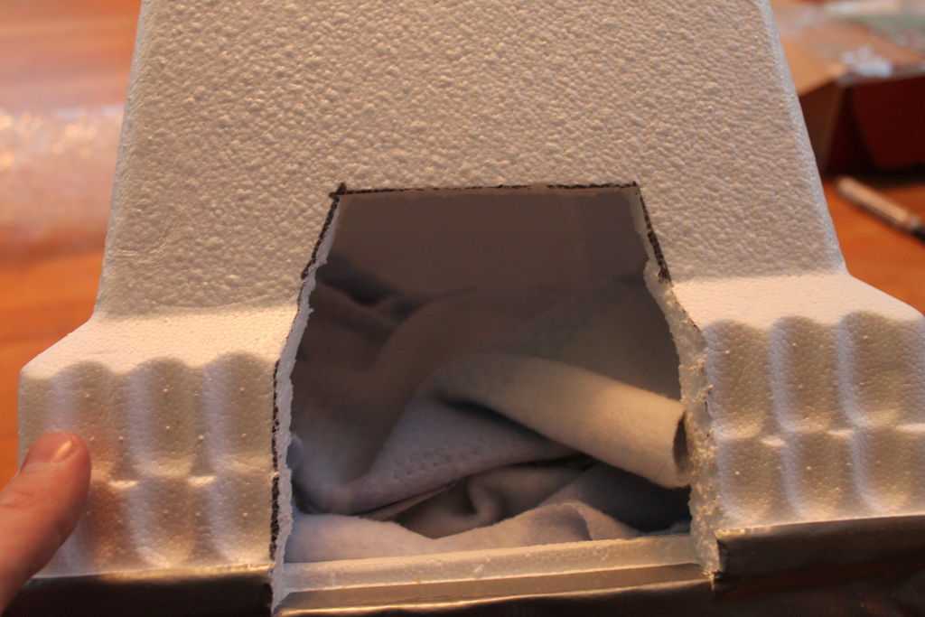 Когда конструкция дома готова, настало время утеплить его. Для этого я использовал вату, но вы можете использовать любой другой материал, главное, чтобы вашему питомцу было тепло, а вы могли легко заменить утеплитель при необходимости. Тоже самое касается и ткани.