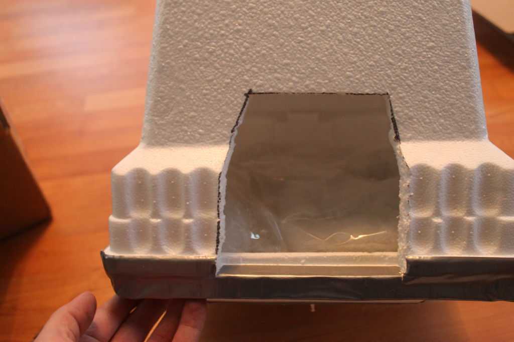 После того как конструкция утеплена изнутри, створки маленькой (внутренней) коробки нужно закрыть, а в ее крышке, в углу – вырезать вход. Удобный размер – 14х14 см. Края входного отверстия надо проклеить скотчем, чтобы они не истрепались слишком быстро. У большой коробки крышка и стенки создадут некий навес и защитят от ветра кошкин дом вместе с усатым-полосатым обитателем.