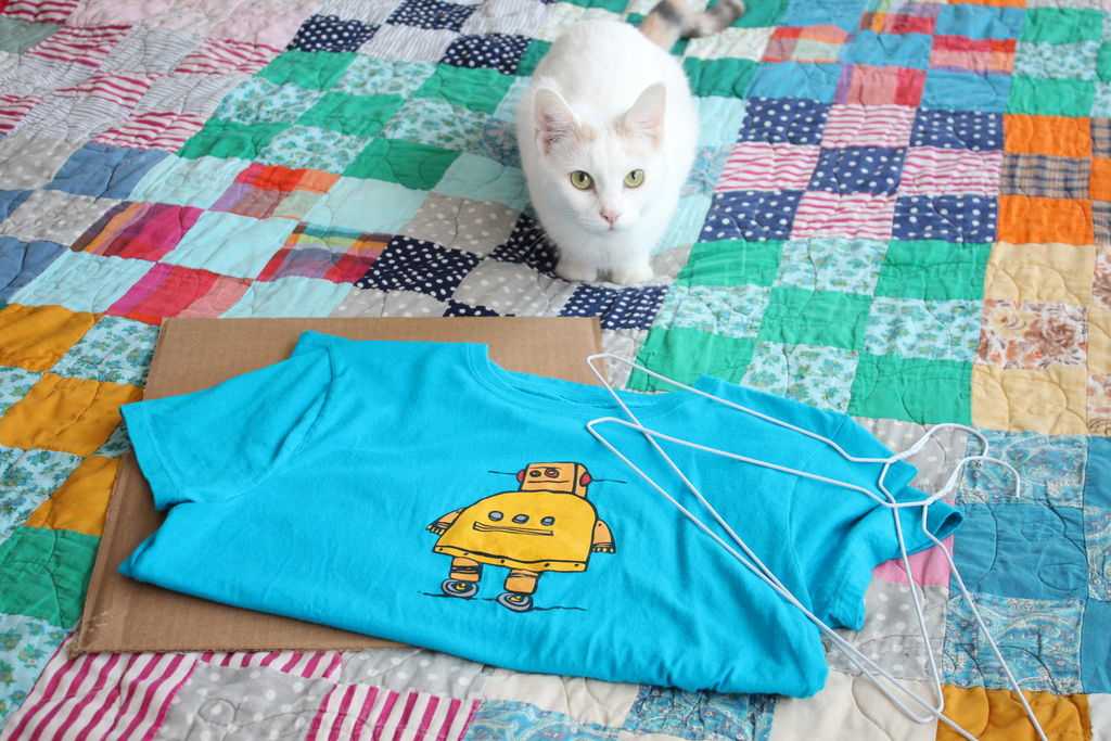 Такую палатку для кошки смастерить может каждый. Понадобится всего лишь яркая футболка, пару вешалок из проволоки и картон.