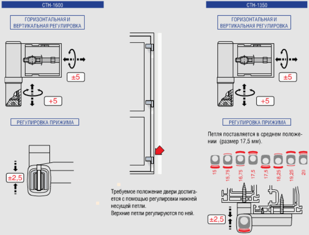 Регулировка пластиковых дверей по горизонтали (ось X) вправо или влево может проходить при помощи двух винтов в нижней и верхней петле (в зависимости от того, какая часть двери «затирает»).
