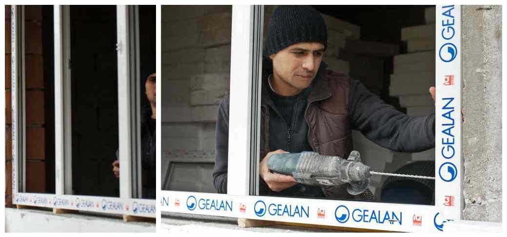 В момент сверления важно удерживать рамы в отрегулированном положении. Стена сверлится на глубину 6-8 сантиметров. Раму в стене фиксируем при помощи анкеров