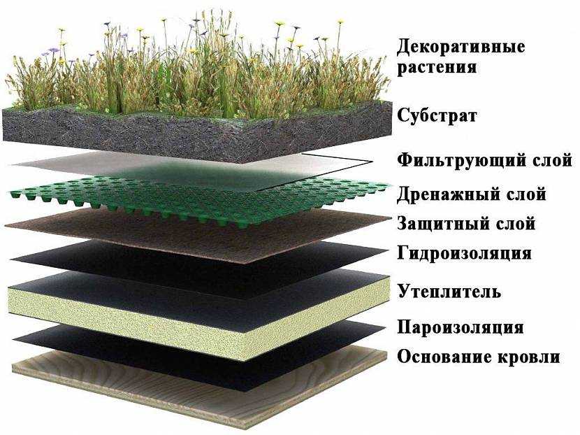 Если не учитывать разные варианты кровельного покрытия, то на бетонном перекрытии используется та же самая очередность слоев, что и на деревянном, кроме одного нюанса – организации уклона для отведения осадков во внешнюю или внутреннюю систему водостока. И здесь может использоваться несколько решений: