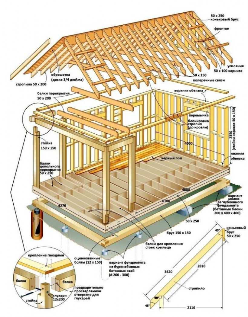 - Нижняя обвязка – периметральная рама из мощного деревянного бруса, которая несет нагрузки от стен и передает их на фундамент.