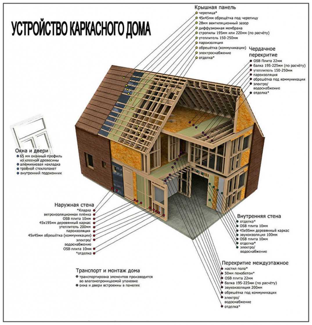 Каркасный дом в разрезе – на схеме видно расположение утеплителя