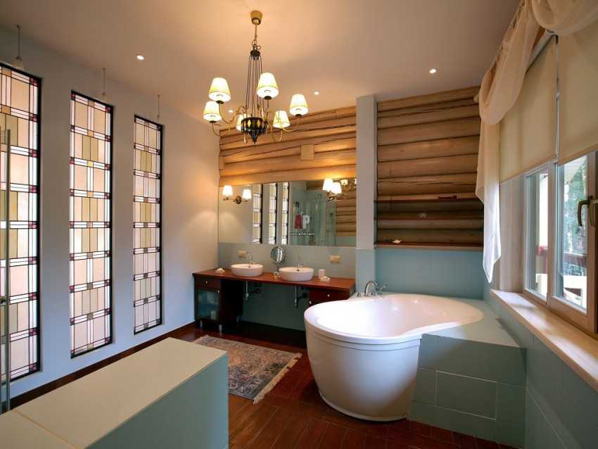 Зачастую в таких домах практикуется комбинированная отделка стен – общая их масса оформляется под дерево, а в тех местах, где особо велик риск разбрызгивания воды, стены облицовываются плиткой. Как правило, все это оформляется под отдельный декоративный элемент интерьера. Например, угол, в который будет установлена ванна. обшивается гипсокартоном так, чтобы этот участок стены выглядел выступающим элементом, и отделывается кафелем – в большинстве случаев его даже подсвечивают, усиливая таким образом восприятие этой функциональной зоны. Точно так же можно поступить и с участком стены возле умывальника .