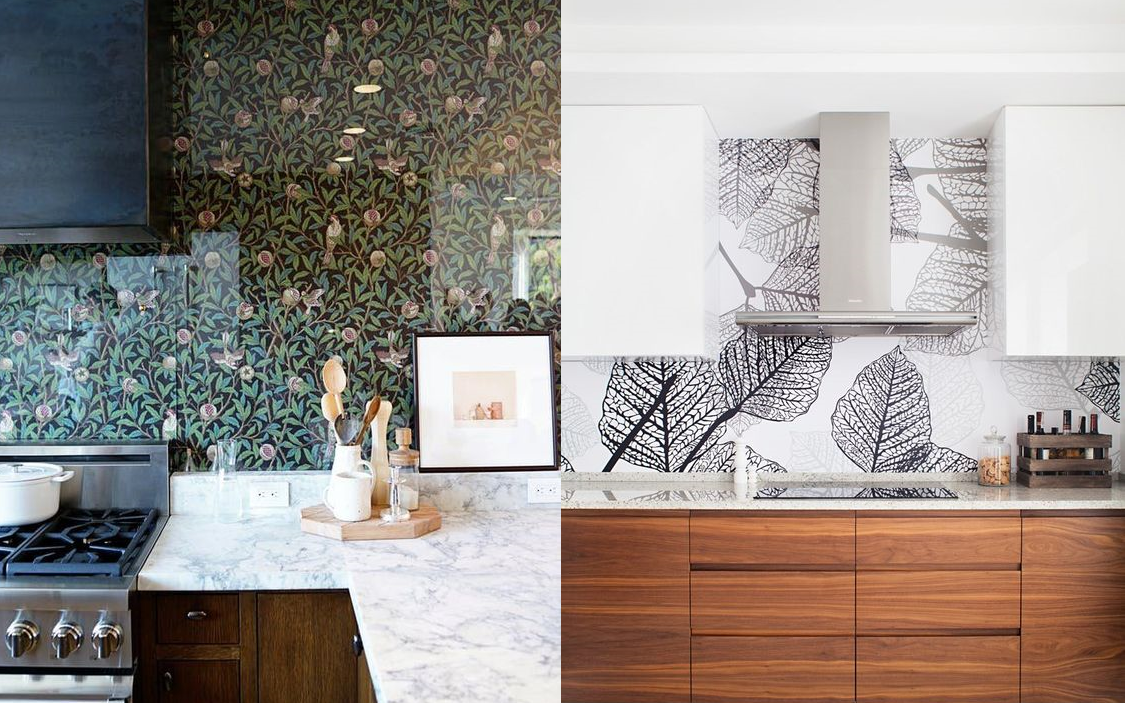 Обои в кухонной зоне могут существовать даже в местах повышенной опасности, куда действительно долетают брызги масла и воды, то есть непосредственно над плитой, раковиной и рабочей поверхностью, где мы привыкли видеть практичный кухонный фартук. Хитрость в том, чтобы спрятать обои под прозрачным стеклянным экраном.