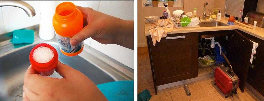 - поваренная соль (достаточно просто всыпать в сливную трубу большое количество соли, а спустя пару часов смыть потоком горячей воды);