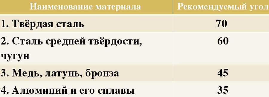 - 45 градусов для мягких материалов (латунь, медь);
