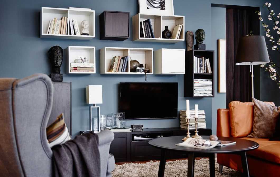 Черный стеллаж Билли в интерьере гостиной — идеи для хранения