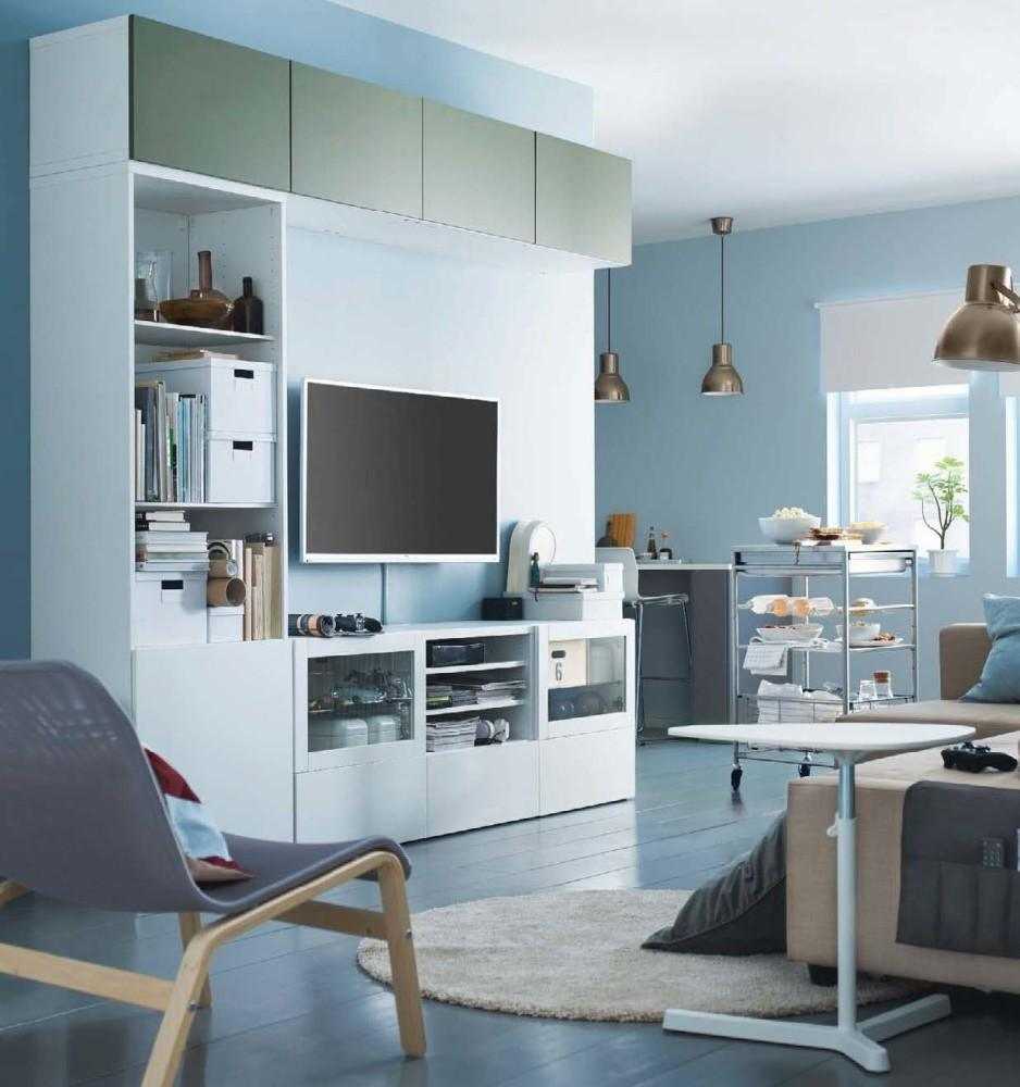 Белый и голубой — стенка Бесто в интерьере гостиной