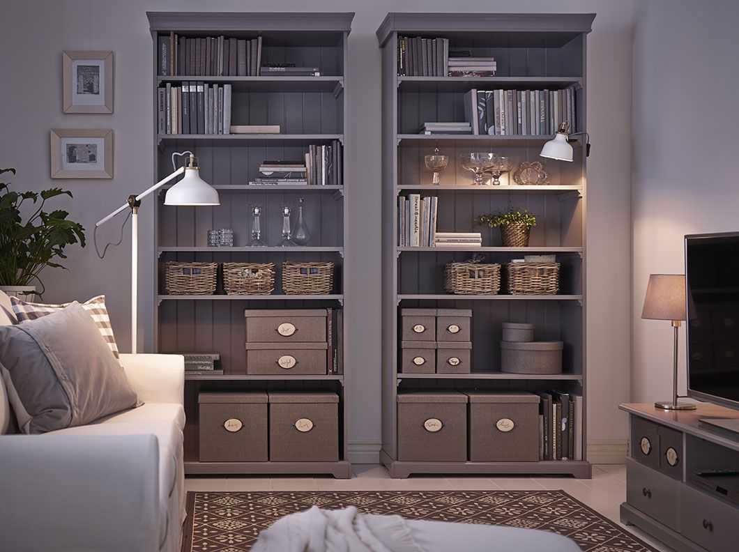 Серо-коричневые стеллажи и шкаф Хэмнес в интерьере гостиной — создаем библиотеку