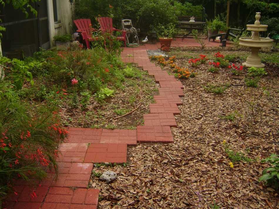 Кора выделяет специфические смолы, что весьма полезно для человека, опилки предотвращают рост сорняков. Дорожка из таких подручных материалов не нагревается даже в самую сильную жару.